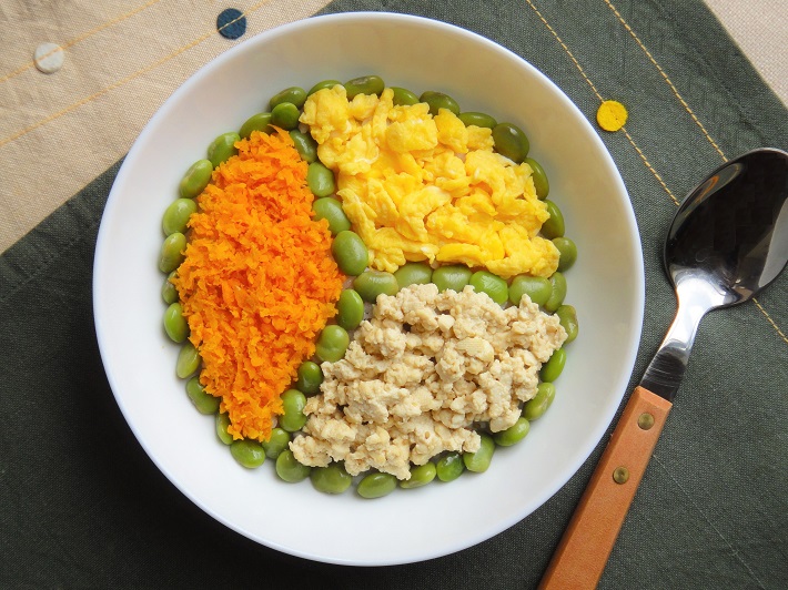 ⑥お皿にご飯を盛り、豆腐・いり卵・ニンジン・枝豆をのせて出来上がり。