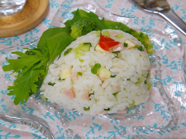 ご飯…約1合分、ロースハム…2枚、プロセスチーズ…20g、きゅうり…1/4本、スプラウト …15g、レモン汁 … 小さじ2、オリーブ油…小さじ1/2、こしょう…少々