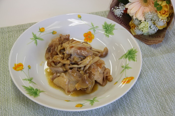 塩コショウした鶏モモ肉の両面に焼き目をつけたらシメジを加え、ひたひたに入れたオレンジジュースとコンソメで汁がなくなるまで煮込むだけ。