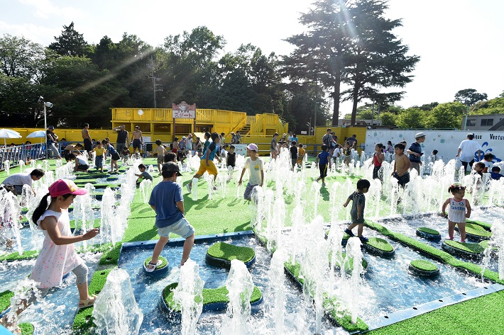 広いじゃぶじゃぶ池の中には緩やかな階段や水が湧き出る噴水があるなど、楽しい上に安心して小さな子どもたちも過ごせます。