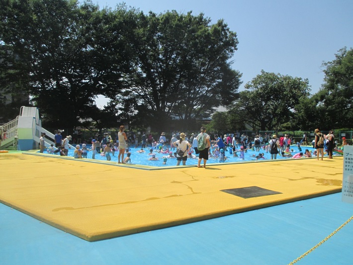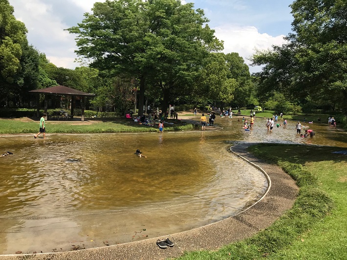 一番深い所でも水深35cm、3台のすべり台もあり毎年夏は子どもたちでいっぱいになる薬円台公園のじゃぶじゃぶ池。