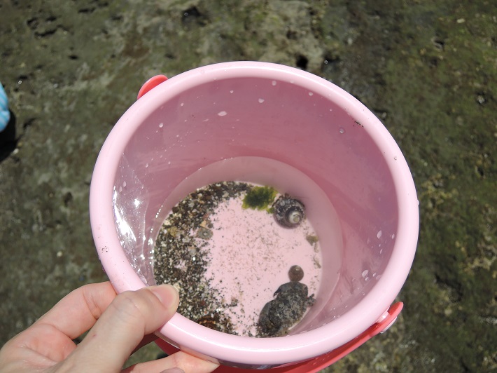 夢中で1時間ほど生き物を追いかけて、ヤドカリ3匹、カニ1匹、小魚2匹をゲット。
