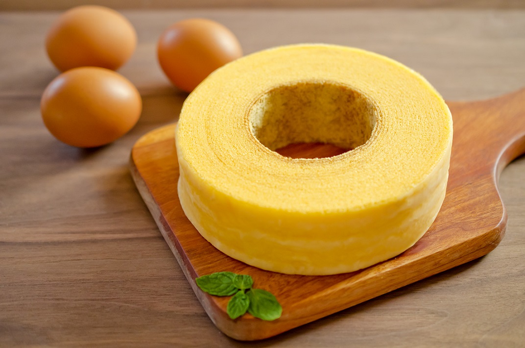 ふっくら厚いスポンジのブッセ「若葉の月」は、卵白と卵黄の配合や生地の温度を研究し、膨張剤を一切使わず作り上げました。