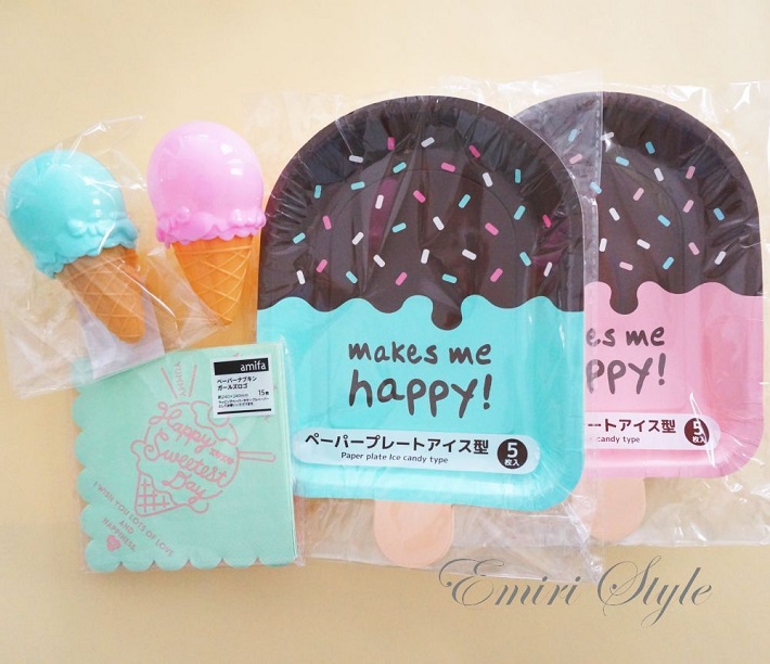 今回は、アイスクリームがテーマなので、アイスクリームの入れ物にお菓子を詰めてテーブルに飾りました~☆