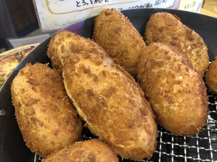 揚げたてのカレーパンが網に乗っていてとてもおいしそうです。ポップによると、このように書いてありました。