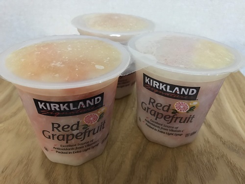 レッドグレープフルーツの皮や種を全て除いて、甘すぎないシロップと一緒にカップに入っています。