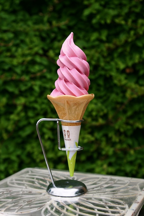 フレッシュなミルクにバラの香りがほんのりするソフトクリーム。ミルク、ミックス、ピンクの3種類あって、一番人気はピンクのバラ味!