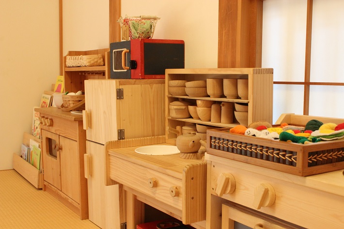 和室を利用したおままごとコーナーは、子どものみならずママも夢中になってしまいそうなかわいいキッチングッズが並びます。