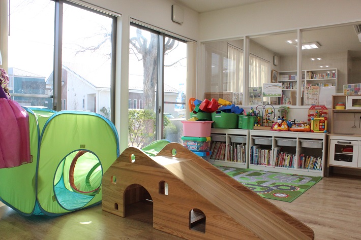 白を基調とした清潔感ある室内には、0~3歳の子ども向けのおもちゃや絵本が配置され自由に遊べます。