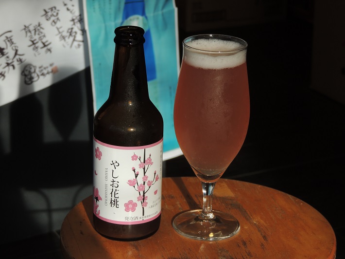 ほんのりピンク色の「やしお花桃ビール」、地元の味で乾杯してみては。(テツ)