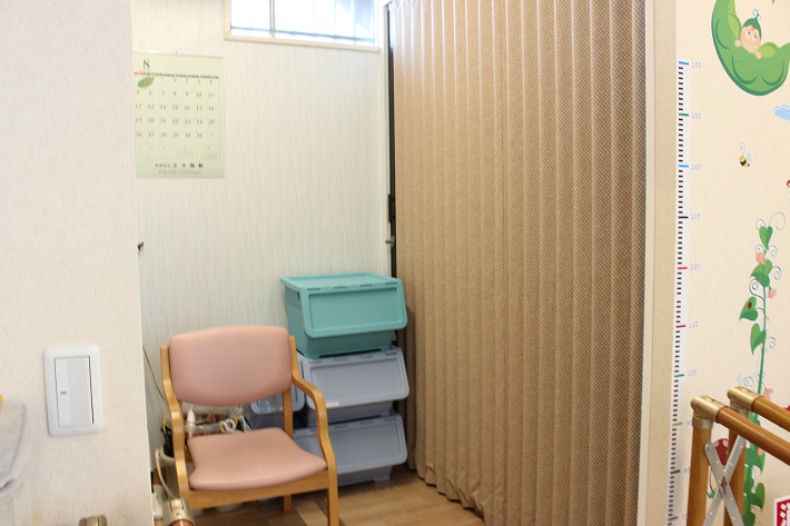 それでは時間がもったいないので、大きな脱衣所をアコーディオンカーテンで2つに仕切り、洗面所側へ移動する事で、ドライヤーをかけている間も別の利用者さんが入浴できるようにしたんです。