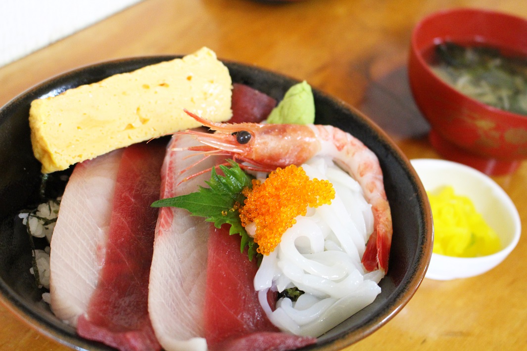海鮮丼のネタが大きくて、プリプリ。旬の寒ブリが最高においしかったです。また、イカの食感も柔らかい…そして甘い! 海鮮丼は見た目が豪華なだけでなく、味も抜群です。