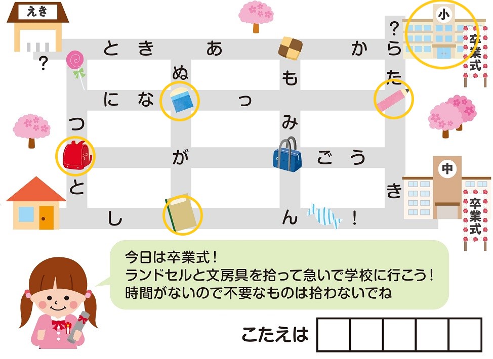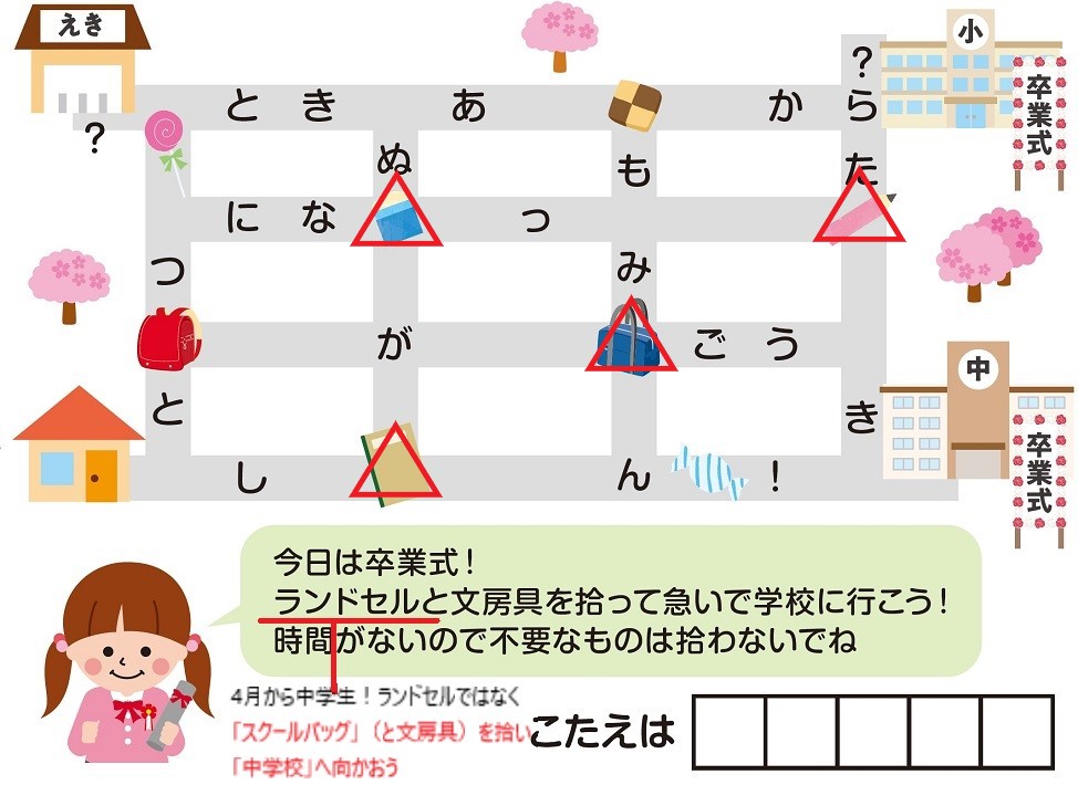 バッグと文房具を拾って、最短で中学校へ向かうために通る文字(=こたえ)は…