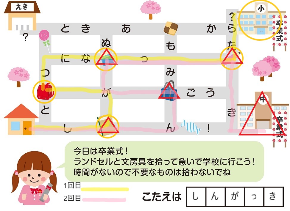 女の子のふきだしの指示に従い、(左下の)自宅から小学校まで、ランドセルと3つの文房具を拾いながら最短のルートで向かおう。