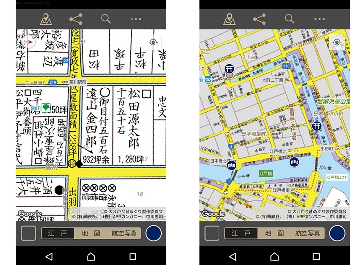 江戸時代と今の地図を簡単に切り替えられ、見比べられます