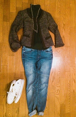 上の写真のようなツイードのノーカラージャケットなら、デニムにタートルネックを合わせ、カジュアルに着回すことも出来ます。