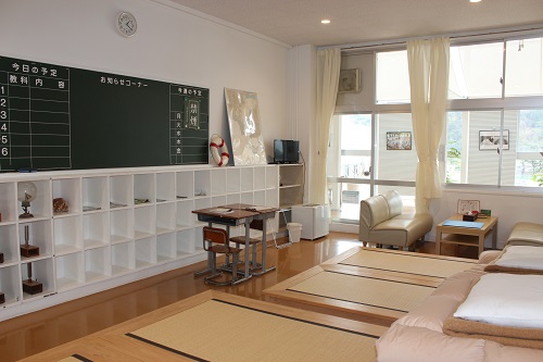 かつての教室の風合いを残した客室は、棚や黒板もそのまま残してあります。