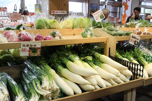 地元の農家で採れた産直野菜の販売コーナーでは、お客さんが野菜を手に取りやすいよう、ディスプレイも工夫されています。