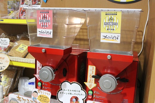 袋入りのローストピーナッツ(アメリカ産648円、国産1296円)を購入し、袋を開けて自分でマシンに投入!