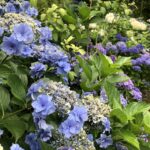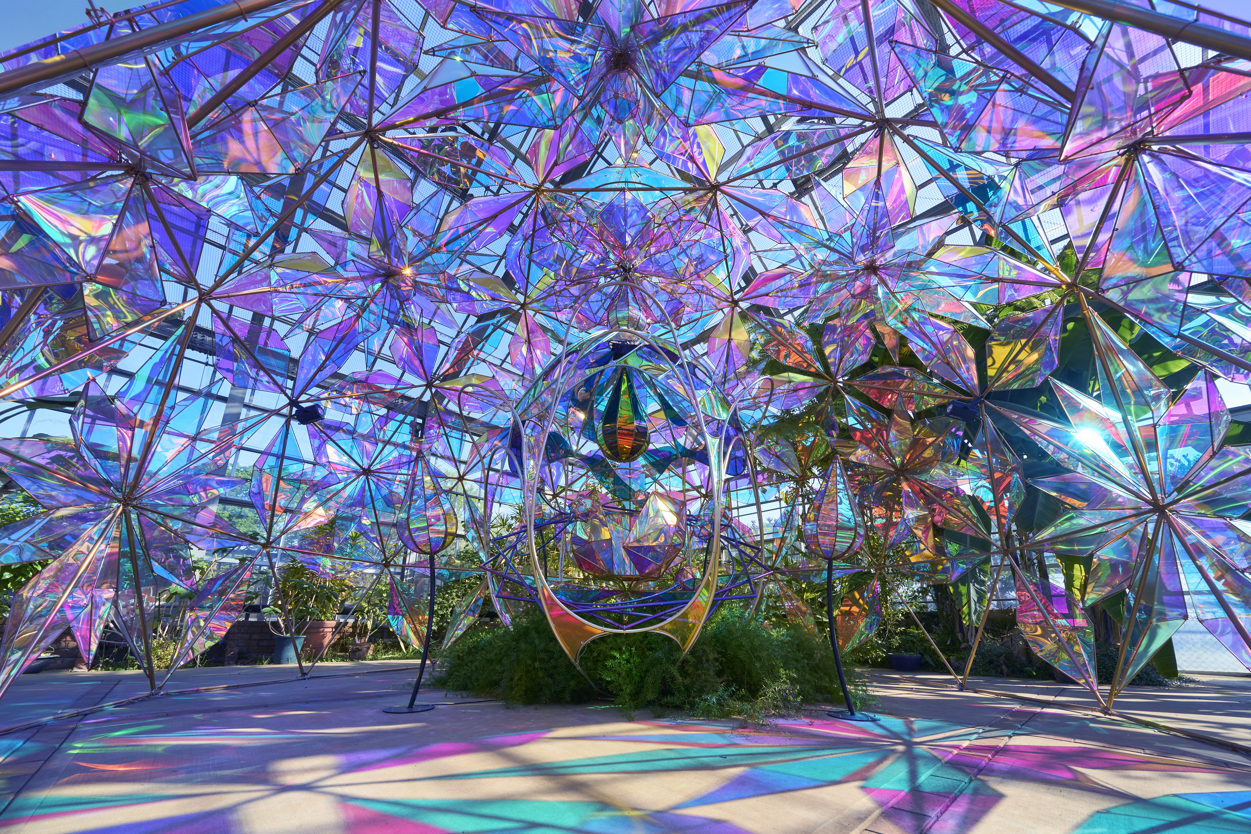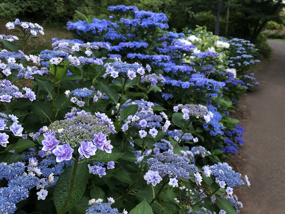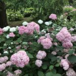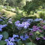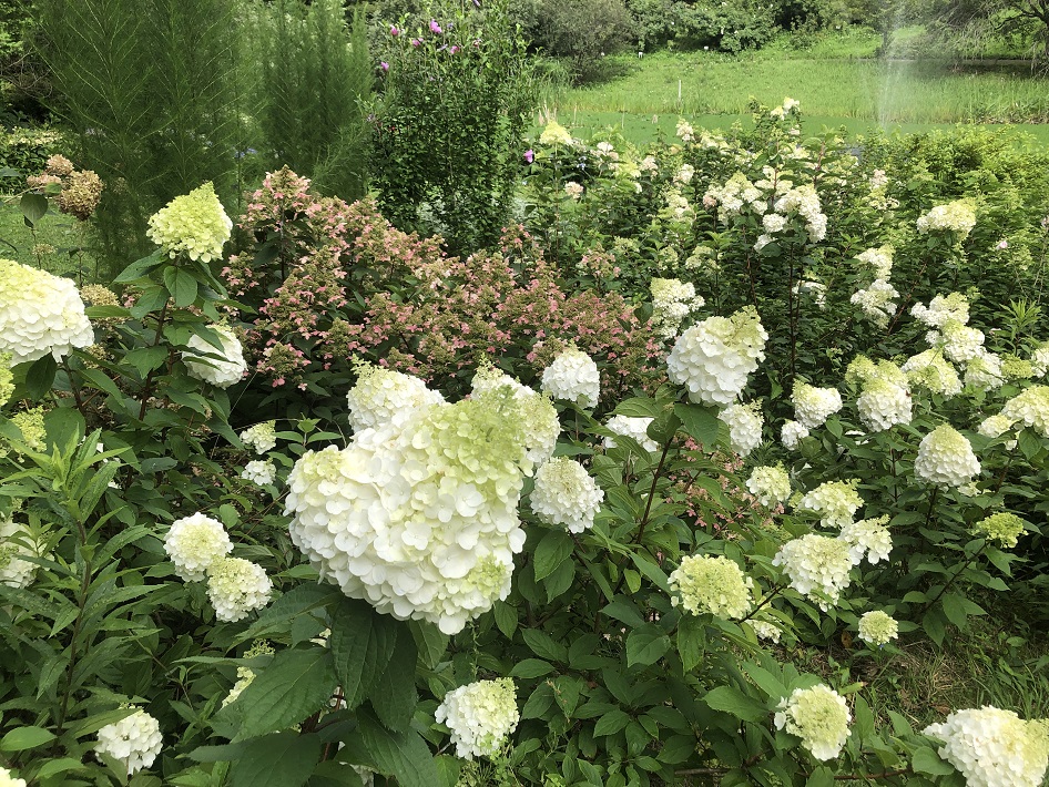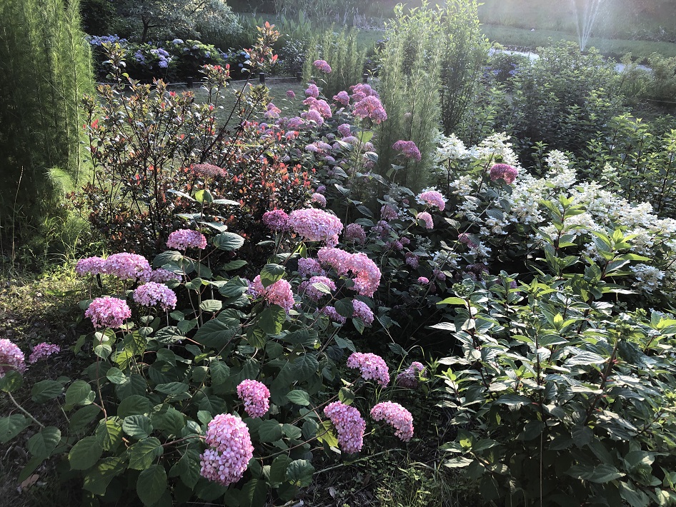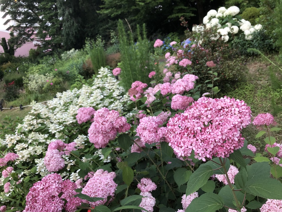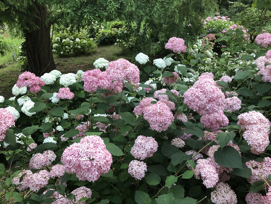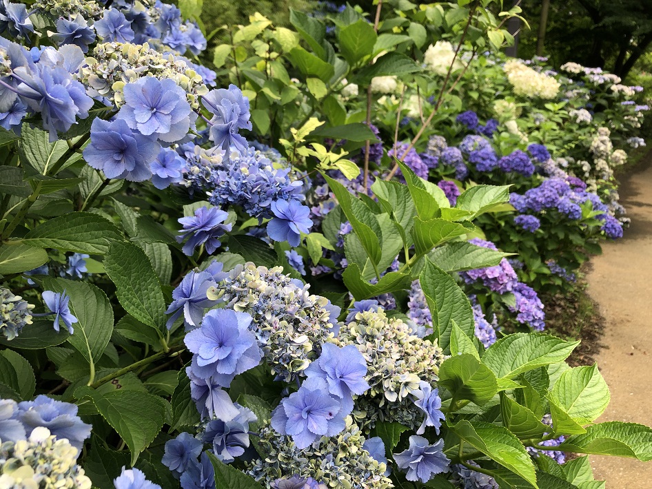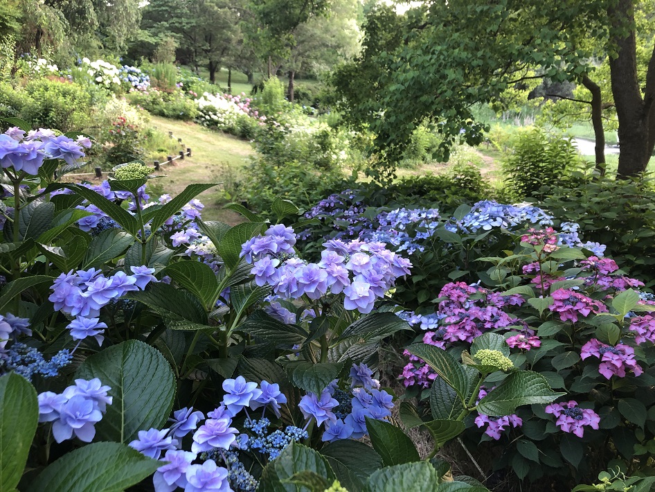 6月中旬からは奥の自然風庭園であじさいが色づき始めます。池の周りに早咲きから遅咲きまで約410品種のあじさいが次々と見頃を迎え、お散歩をしながらの森林浴も。大温室では、日本あかり博とアート集団ミラーボーラーがコラボレーションした「光とバラのインスタレーション」を常設展示しています。直径6mのドームの中にもバラをモチーフとした作品が添えられています。