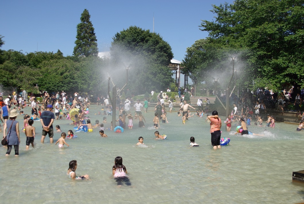 夏になると多くの子どもたちでにぎわいを見せるじゃぶじゃぶ池は公園の人気スポット。