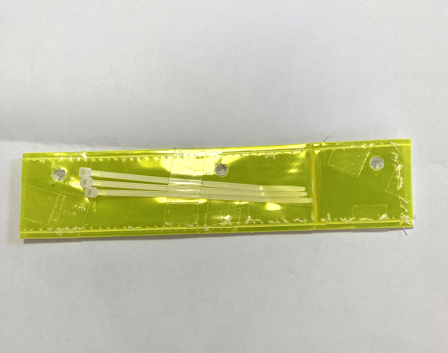 100円ショップで手に入る「反射タスキ」を8等分に切り、それを固定するために裏に同じ大きさに切ったプラスチックをセロテープで留めるだけ。