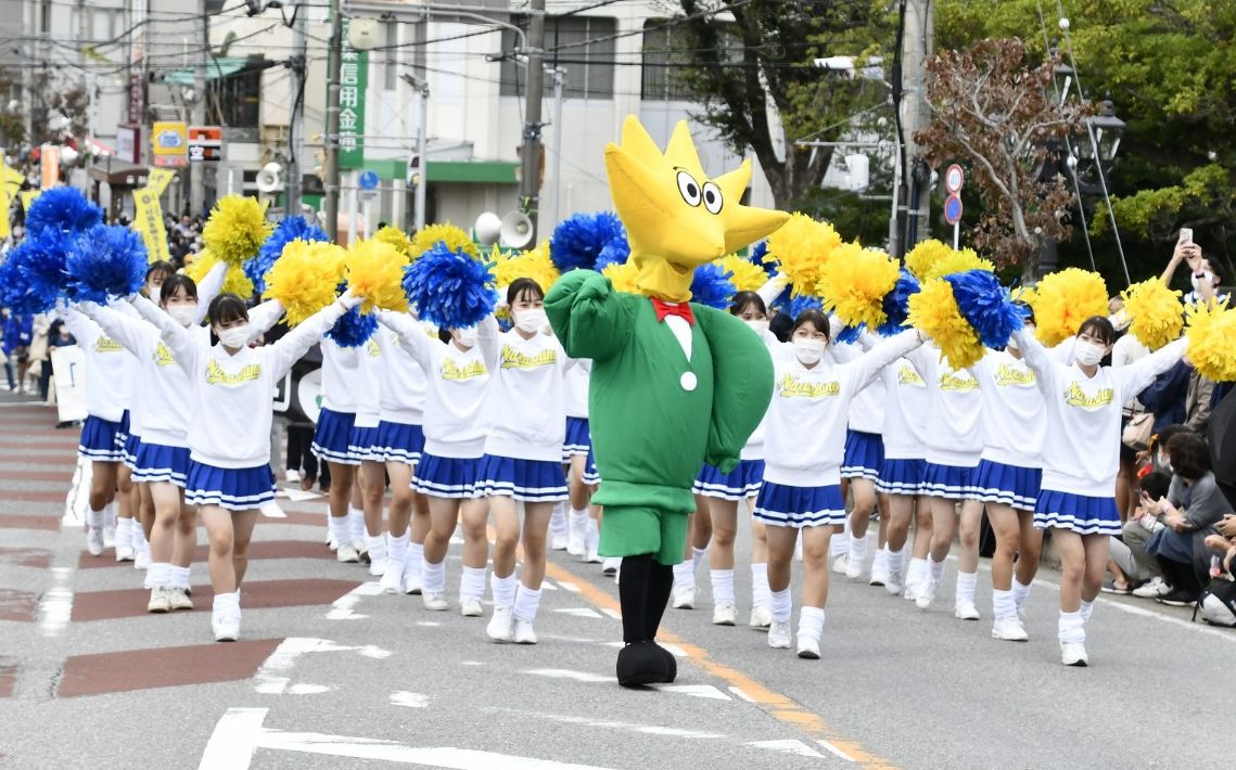 きらっと君を先頭に、習志野高校バトン部の先導で、市内の団体が思い思いのパフォーマンスでパレード。