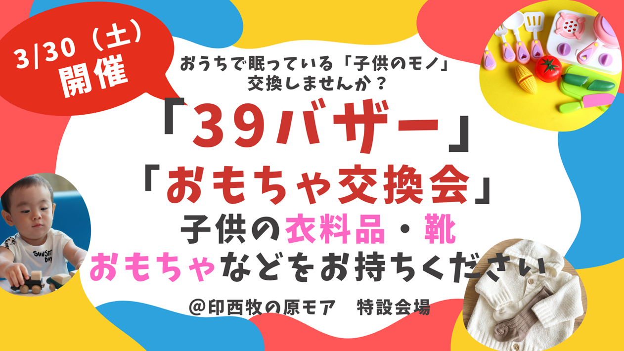 定期イベント「モアマルシェ」内に「39バザー」ブースを出店します。この日は子供服などを交換できる「39バザー」以外に「おもちゃ交換会」、「わくわく縁日」(寄付&購入者限定)も開催!