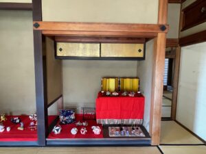 旧吉田家住宅では、ゆかりの人から寄せられた昭和40年代の七段飾りをはじめ、つるし飾りや、陶器でできた陶びなが飾られています。