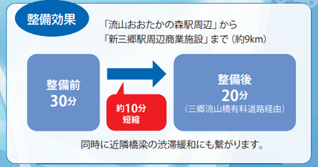 埼玉県道路公社によると、三郷流山橋有料道路を利用することで、「流山おおたかの森」駅周辺から新三郷駅周辺商業施設までの約9kmの車での移動時間が、約30分から約20分に短縮されるとしています。