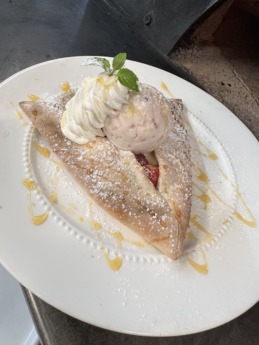 ドルチェピッツァは、旬の千葉県果物とカスタードクリームをピザ生地にのせて三角形に包み窯で焼き上げ、地元 山崎農園のジェラートをトッピングするスイーツです。ジェラートは、好きなものを選ぶことができます。