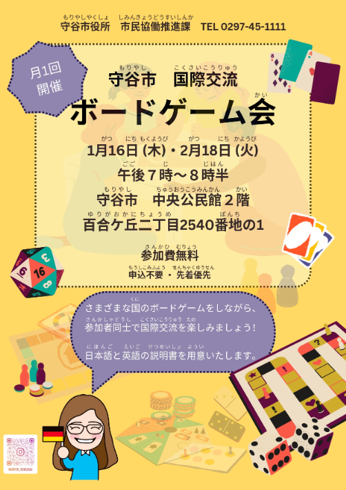 ボードゲーム会は守谷に住むすべての人が参加でき、さまざまな国のゲームで遊びながら国際交流を図るのが目的です。