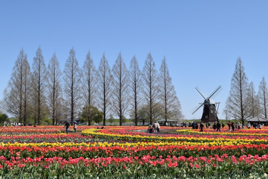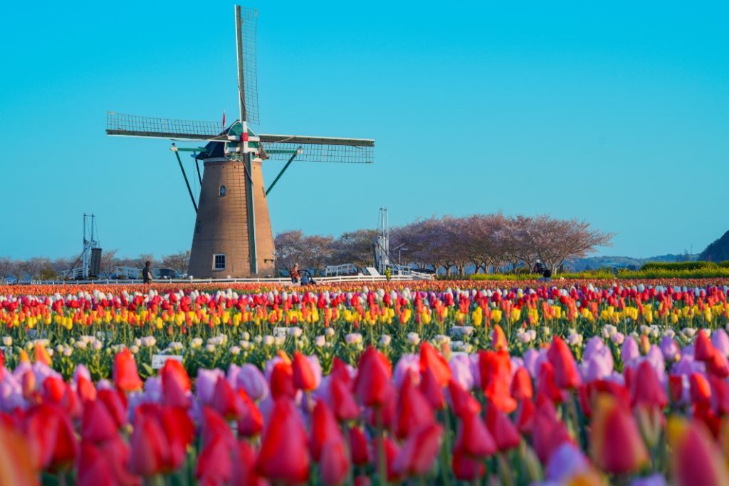 赤・黄色・白などカラフルなチューリップと風車の絶景を楽しみながら春の訪れをぜひ楽しんでみてください。