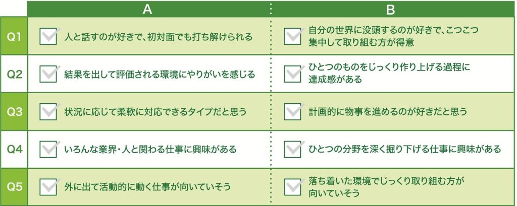 次の5つの質問で、AとBどちらがより当てはまるか答えてください。