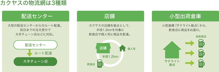 カクヤスは、飲食店と家庭のいずれにも酒類などを販売している点が強み。店頭販売だけでなく、指定場所に短時間で配達する画期的なサービスが喜ばれています。小型倉庫のような役割を持つ出荷拠点を、飲食店が集中する繁華街に設置することで配達を効率化。東京23区などのエリアで、1時間単位での時間指定、無料配達を実現させています。他に類を見ない独自の流通網を活用し、今後は酒類にとどまらず、食品や生活必需品の販売・配達にも注力。生活を支える「流通のインフラ」を目指し、さまざまな挑戦をしています。