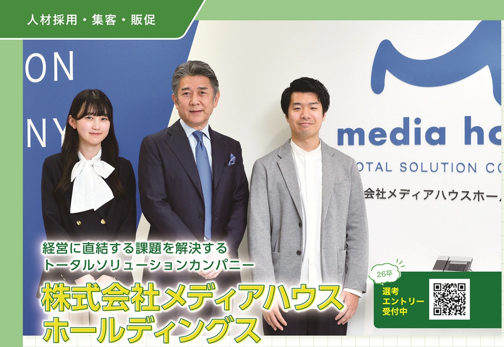 メディアハウスホールディングスは、「全国の中小企業を元気にする」というミッションを掲げ、1983年に設立されました。現在は、「人材採用のサポート」(HR Tech)、「Webを使った集客支援」(Mar Tech)、「広告デザインの制作」(C Tech)の3事業を軸に、トータルに中小企業を応援しています。