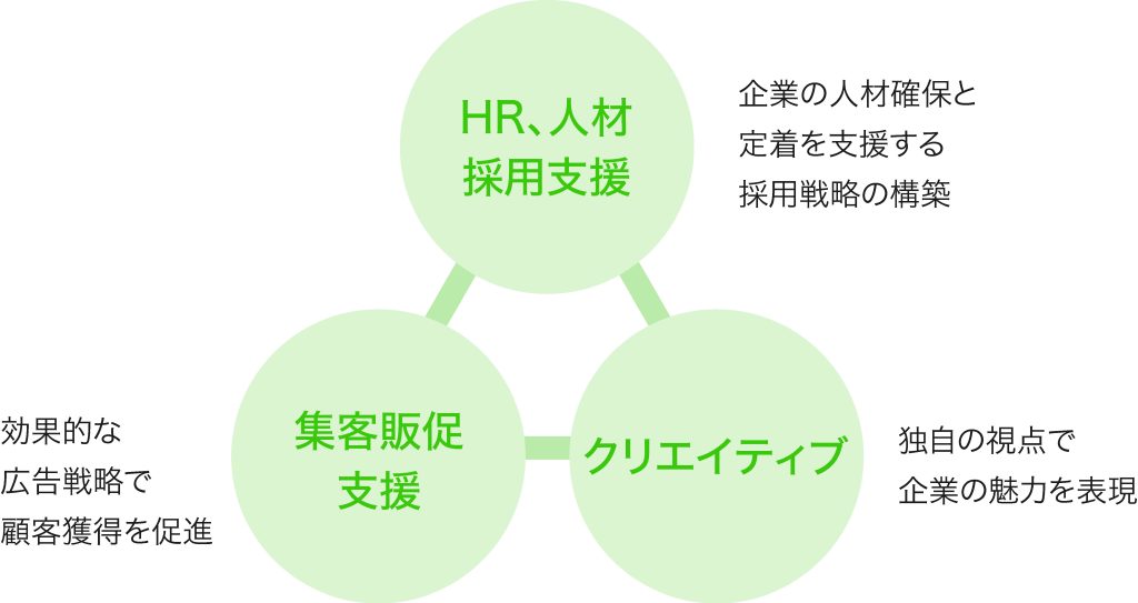 企業の悩みである「人を採用したい」「お客さんを増やしたい」という課題をワンストップでサポートしています。