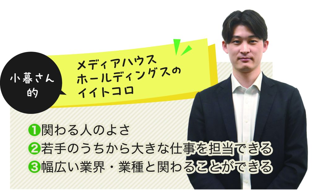 飽き性なところがあるので、さまざまな業界に関わりたいという思いで広告代理店を志望していました。実際に面接などを経験する中で、人のよさや会社の居心地のよさが伝わってきて、この会社に決めました。まだ3年目なので周囲はほとんど上司という環境ですが、自分が意見を言ってもしっかりと受け止めてもらい、業務に反映してもらえる安心感があります。