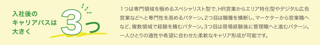 求人広告の営業を担当し、企業の採用を支援しています。広告は必ず効果が出るものではないので、お客さまの期待通りの結果がなかなか出ないときは苦労しますが、時期によってビジュアルや内容を細かく調整するなどの対策を取り、期待通りの効果を上げられたときに一番やりがいを感じます。