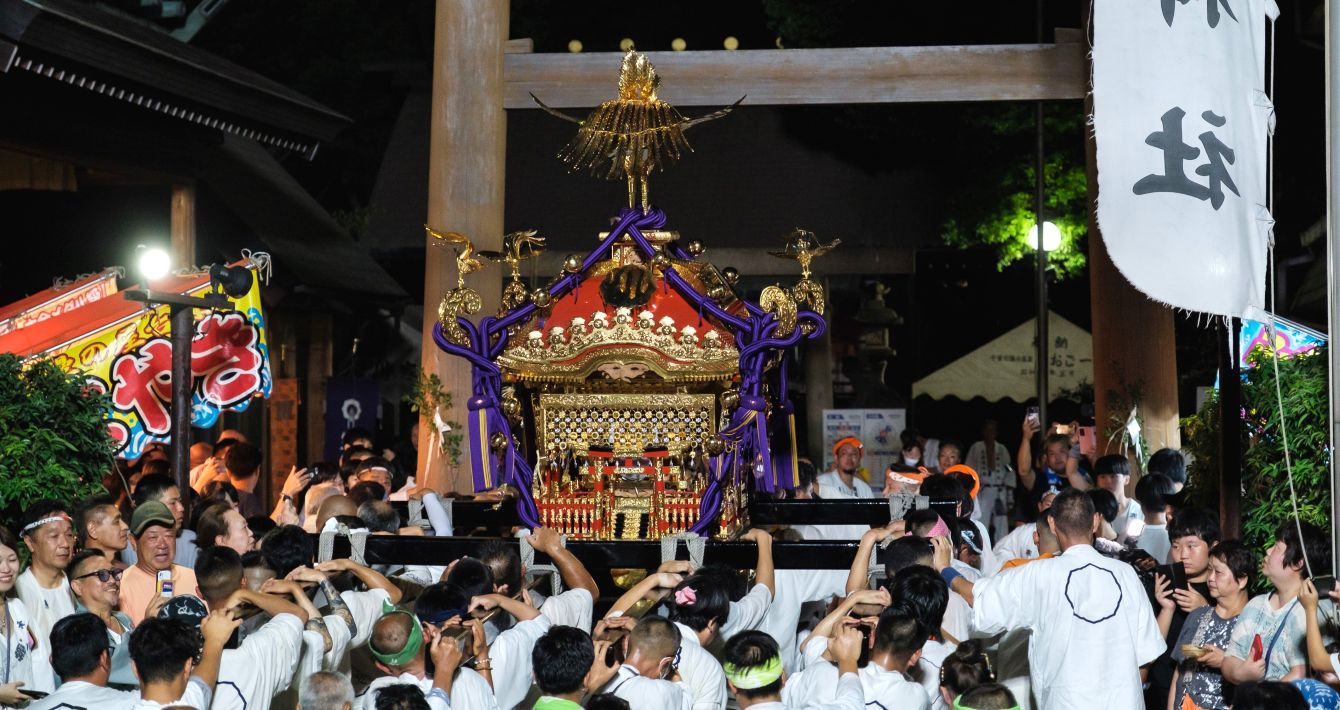 埋立て前は神社の近くに海があり、神輿が町内を練り歩いた後、神輿を海に入れていましたが、復活後はポートタワーの海まで神輿や担ぎ手をバスで運んでいます。
