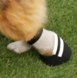 「何とかしてあげたい」と思ったみちるさんは、試しにイヌ用の靴をビーモ君に履かせてみました。