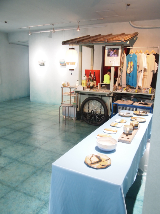 壁も床もブルー系で統一されたシンプルな空間は、展示ごとに雰囲気ががらりと変わります。