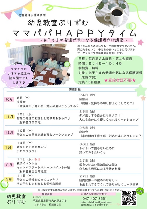 児童発達支援事業所「幼児教室ぷりずむ」では、毎月2回、子どもの発達が気になる保護者らが集い交流する「ママパパHAPPYタイム」を設けています。