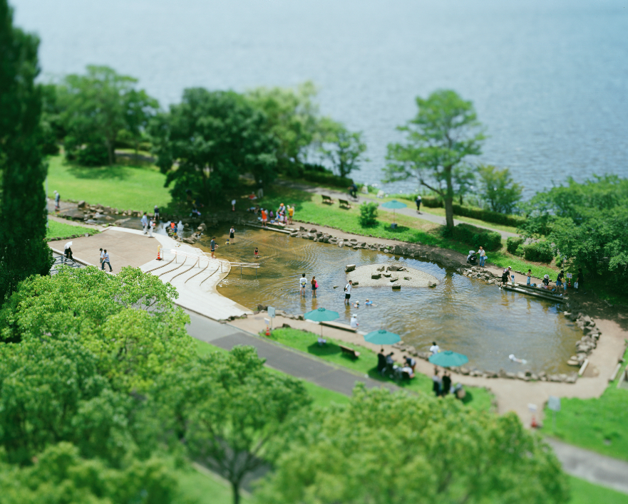 本城さんは我孫子市在住の写真家で、『small planet』(リトルモア、2006年)で第32回木村伊兵衛写真賞を受賞。蛇腹の付いた大盤フィルムカメラを利用し、独特の手法で風景をジオラマのように撮影した作品は、現実の都市や自然の中にある人工物や人間までもがミニチュア化され、見ていると別世界に誘われたかのような不思議な感覚に陥ります。