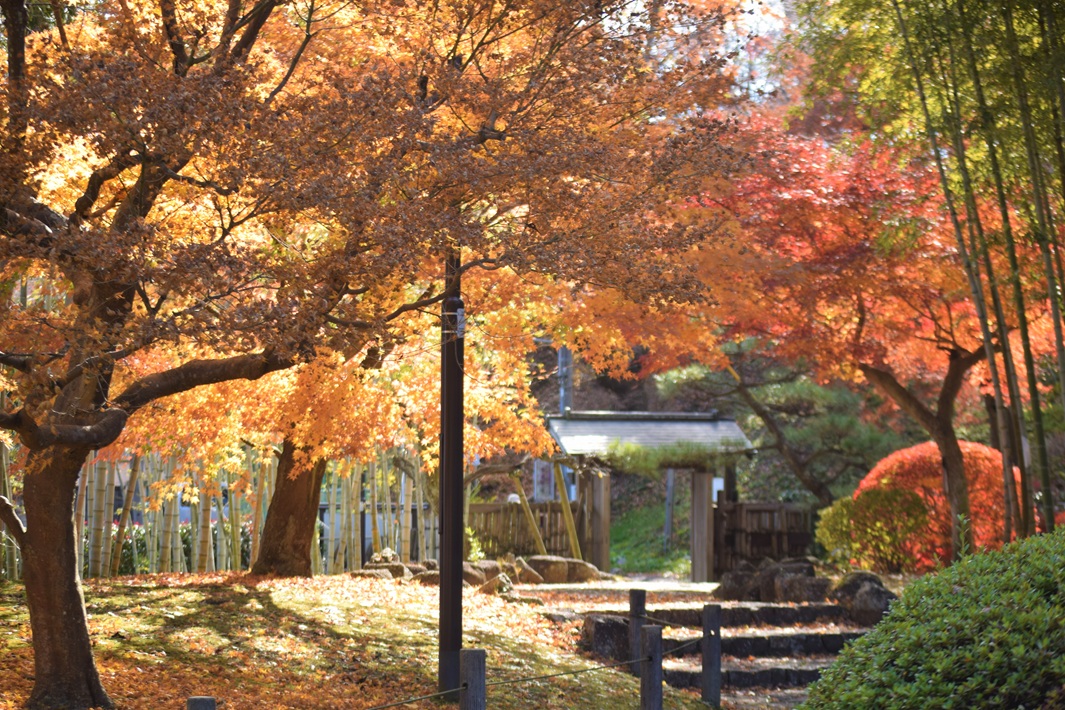 大正から昭和初期に建てられた別荘で、現在は市の指定文化財。庭には多くの樹木が植えられ、燃えるようなモミジが秋を彩る。当時の面影が残る建物と紅葉による景観は絵になり、いつもと違う趣の紅葉を満喫できる。
