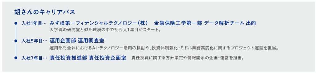 1年目は、出資会社の「みずほ第一フィナンシャルテクノロジー」へ出向。さまざまな分野のデータ分析を行い、分析の基礎力と応用力を培うことができました。その後、本社に異動し、運用企画部を経て、現在は責任投資推進部という部署に所属しています。具体的には、温室効果ガス(GHG)排出削減に向けて、進捗管理や要因分析、定量分析、開示資料や報告書の作成に取組んでいます。データ分析という大きな枠の中で、新しい領域に携われるのも当社の魅力。調査結果がサービスに反映されることで、皆さんの暮らしを良くするお手伝いが微力ながらできているという実感もあります。
