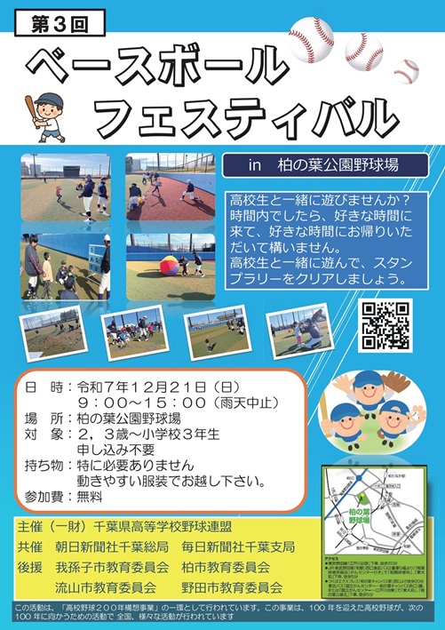 一般財団法人 千葉県高等学校野球連盟(千葉県高野連)が主催する「第3回べーすぼーるふぇすてぃばる」が、 12月21日(日)に柏の葉公園野球場で行われます。