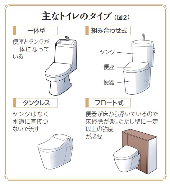 トイレは便座・便器・タンクからなり、それらの構造から主に図2のようなタイプに分けられます。