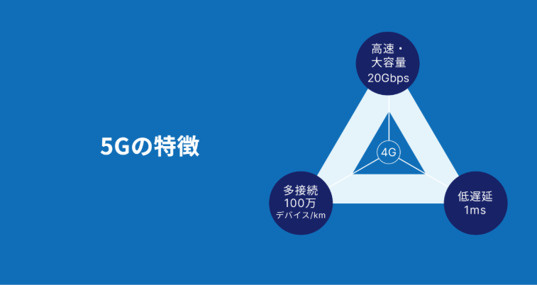 5Gとは、第5世代移動通信システムのことで、従来の4Gに比べて「高速・大容量」「低遅延」「多数同時接続」といった特長を持つ通信規格です。