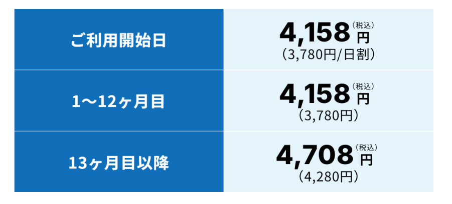 利用料金は、ご利用開始日から1~12ヶ月目までは月額4,158円(税込)(日割りの場合は3,780円)で利用可能。13ヶ月目以降は月額4,708円(税込)となります。シンプルで分かりやすい料金設定のため、初めてWi-Fiサービスを利用する方でも安心して始めることができます。